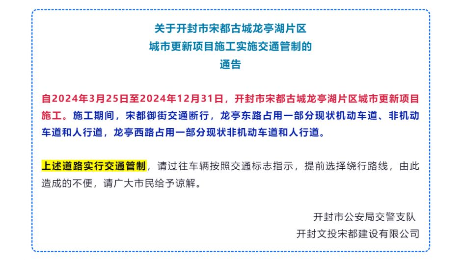 自2024年3月25日至2024年12月31日,开封市宋都古城龙亭湖片区城市更新项目施工。施工期间,宋都御街交通断行,龙亭东路占用一部分现状机动车道、非机动车道和人行道,龙亭西路占用一部分现状非机动车道和人行道。