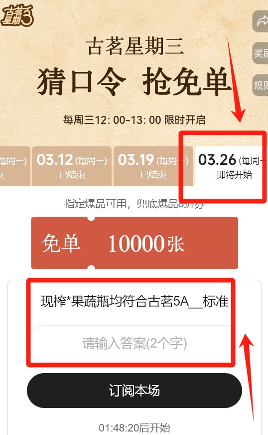 关于“古茗猜口令活动”的免单攻略,以下是一些一般性的建议,但请注意,具体活动和口令可能会随时间变化,以下信息可能不适用于3月26日的最新活动。