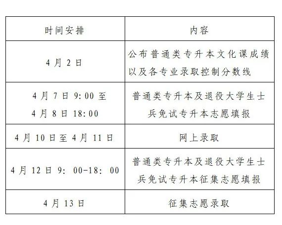 4月7日9:00至4月8日18:00,进行普通类专升本和退役大学生士兵免试专升本网上志愿填报。