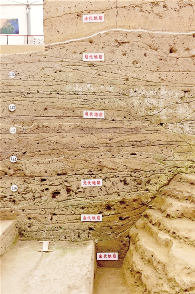 今天的开封城下,应该有6座城:清代开封城的地面在地下约3米处,明代开封城约在地下5米至6米处,金代汴京城约在地下6米处,北宋东京城距地面约8米深,唐代汴州城距地面约10米深,最下面的魏国大梁城在地下10余米处。