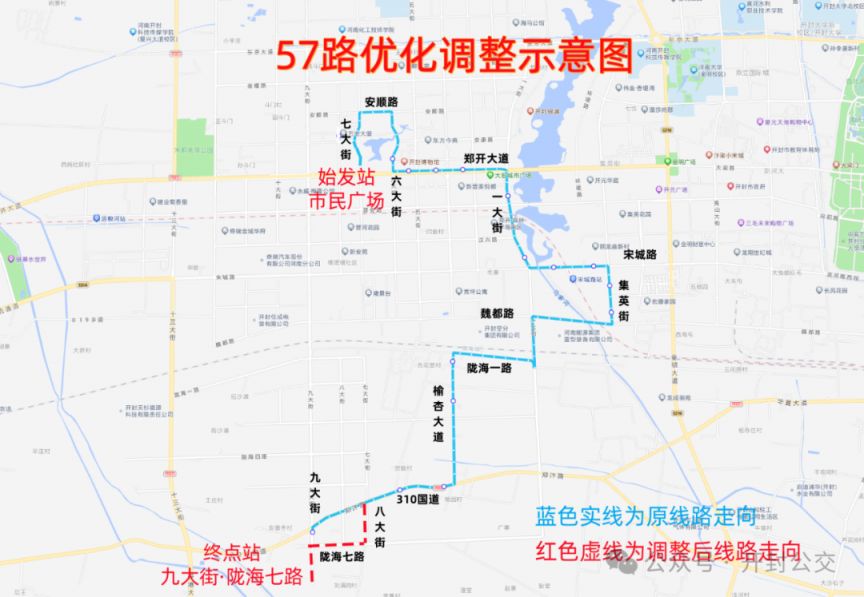 始发站市民广场公交场站-郑开大道·六大街-郑开大道·五大街-郑开大道·四大街-市民之家-一大街·郑开大道-宋城路·一大街-宋城路站-宋城路·集英街-集英街·宋城路-集英街南口-杏花营镇政府-杏花营派出所-310国道·榆杏大道-贺砦村-刘满岗村-八大街南口-九大街·陇海七路。