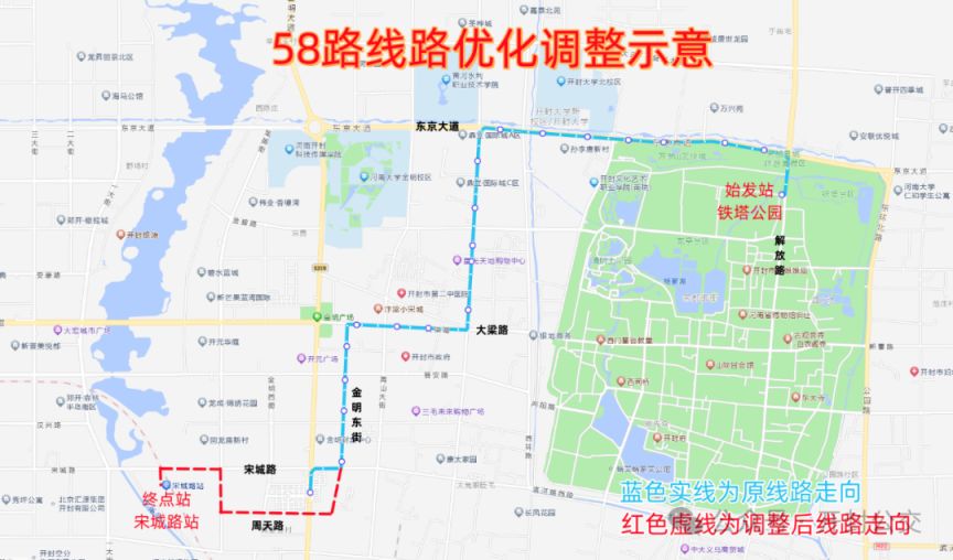 58路:铁塔公园公交一公司-北门外—农科所—党校·警校—王口舌新村—开封市文化艺术职业学院—开封大学—龙翔香格里拉—黄河大街·东京大道—黄河大街·建安街—黄河大街·金耀路—电视塔—市教委—大梁路·武夷街—大梁路·夷山大街—市财政局—金明东街·大梁路—金明东街·晋安路—金明小学—宋城路·金明东街—金明东街·周天路-北宋官瓷艺术博物馆-黄河社区-周天路·集英街-集英街·宋城路-宋城路·集英街-宋城路站公交·六公司。