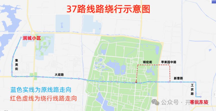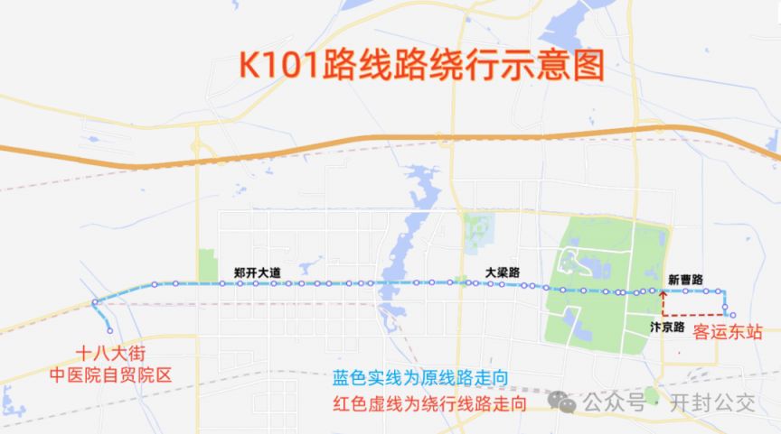 客运东站发车沿汴京路直行向西,沿汴京路至公园路右转向北,沿公园路至曹门大街左转向西恢复原线路。