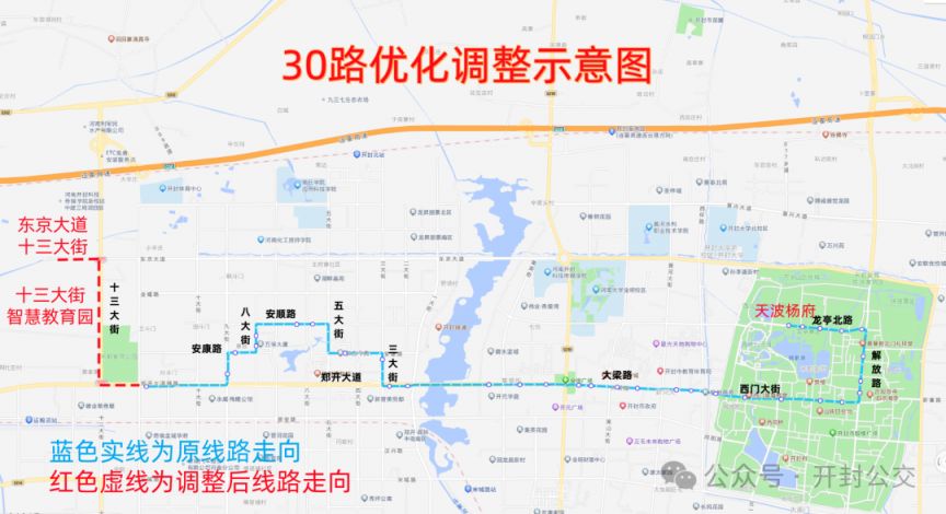 30路原线路走向:天波杨府·公交三公司-文昌后街-体育场-豆腐营街-河大附中-北道门-右司官口-东司门-书店街北口-新街口-西门大街·迎宾路-城隍庙后街-大梁门-马市街-大梁路·黄河大街-大梁路·武夷街-大梁路·夷山大街-市财政局-金明广场·中原银行开封分行-市人大·市检察院-郑开大道·八一街-郑开大道·集英街-郑开大道·一大街-市民之家-三大街·安康路-安康路-安顺路·五大街-开封市城乡一体化示范区管委会-八大街·安康路-安康路·九大街-郑开大道·九大街-终点站自由贸易区。调整后线路走向:天波杨府·公交三公司-文昌后街-体育场-豆腐营街-河大附中-北道门-右司官口-东司门-书店街北口-新街口-西门大街·迎宾路-城隍庙后街-大梁门-马市街-大梁路·黄河大街-大梁路·武夷街-大梁路·夷山大街-市财政局-金明广场·中原银行开封分行-市人大·市检察院-郑开大道·八一街-郑开大道·集英街-郑开大道·一大街-市民之家-三大街·安康路-安康路-安顺路·五大街-开封市城乡一体化示范区管委会-八大街·安康路-安康路·九大街-郑开大道·九大街-郑开大道·十一大街-自由贸易区-开远门-十三大街智慧教育园-东京大道·十三大街。
