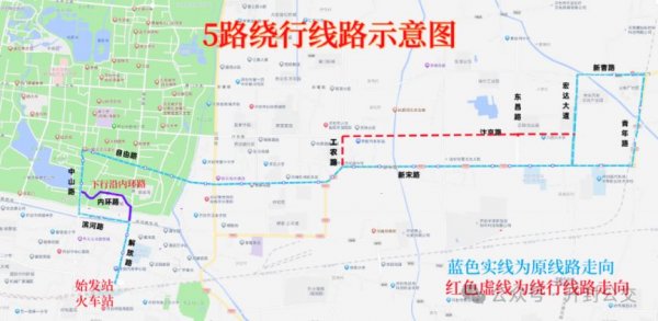 注:因火车站升级改造,不再途径解放路、中山路。金明广场至市人大市·检察院之间站点为上行单循环运行,下行不再经过。