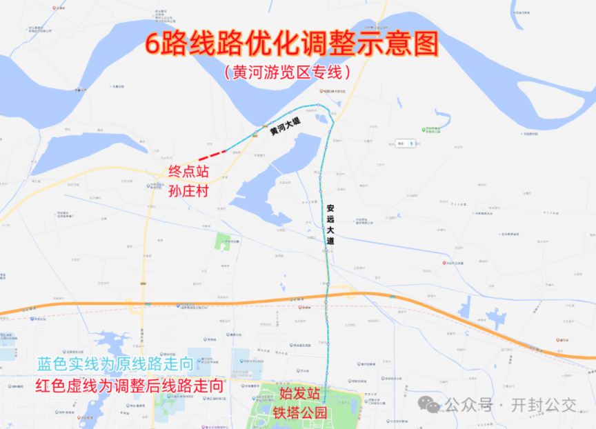6路:铁塔公园·公交一公司-北门外-北郊乡-十七中-私访院-护城堤-龙亭站-卜里寨-牛庄村-牛庄村北-王周庄村-柳园口中学-梅庄村-修防段-小马庄村-大马庄村-黄河游览区-和尚庄-闸口-大堤·312省道-太平庄村-孙庄村。