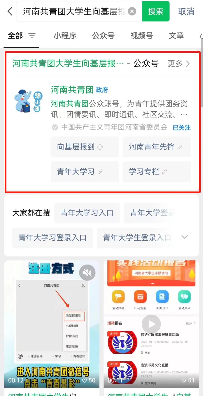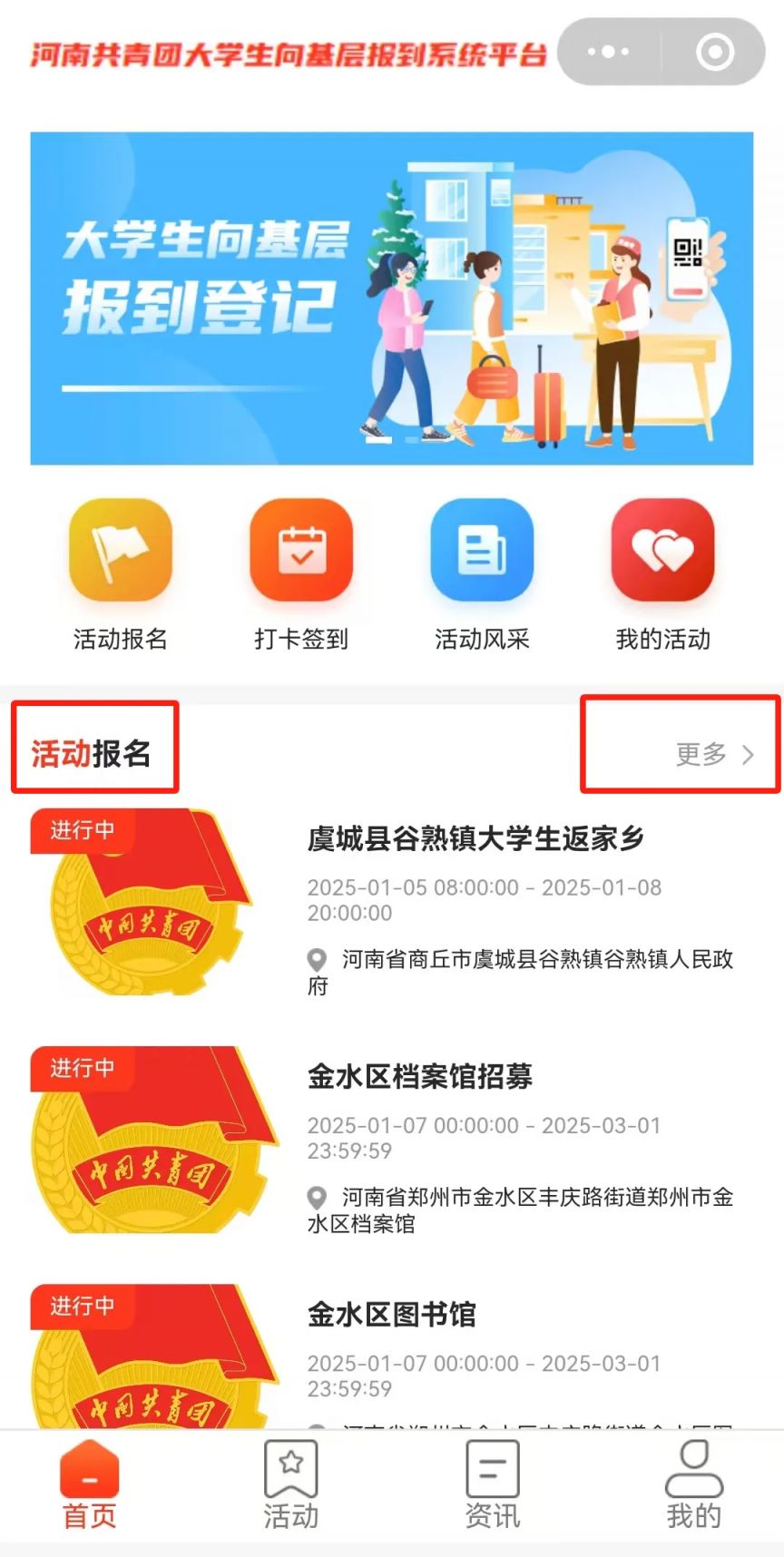 关注“河南共青团”微信公众号,进入聊天内后,选择“青春出彩”——“向基层报道”,进入“河南共青团大学生向基层报道系统平台”,进入后在“活动报名”中点击更多,搜索框里搜索“2025年禹王台区”即可看到共青团禹王台区委员会发布的项目列表,选择要报名的项目后,浏览详细信息,点击“我要报名”即可报名成功。